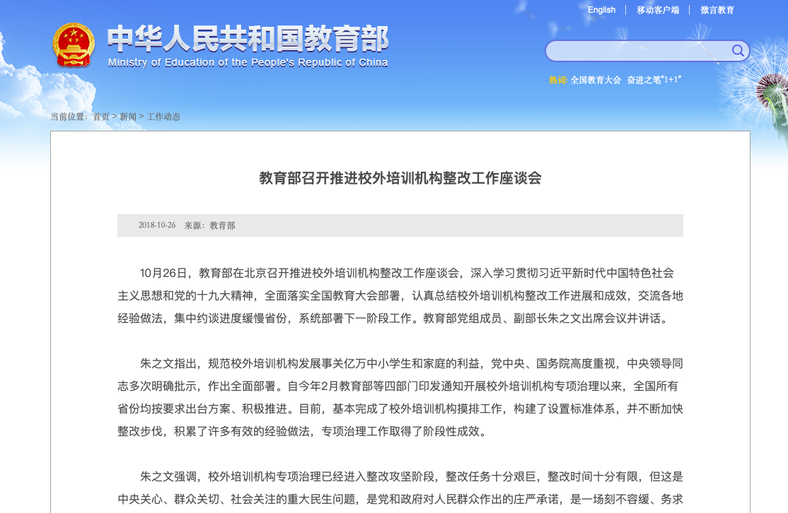 2018年10月26日教育部官網(wǎng)發(fā)消息《教育部召開推進校外培訓機構整改工作座談會》,看得出來,主管部門要把中小學生減負工作進行到底。