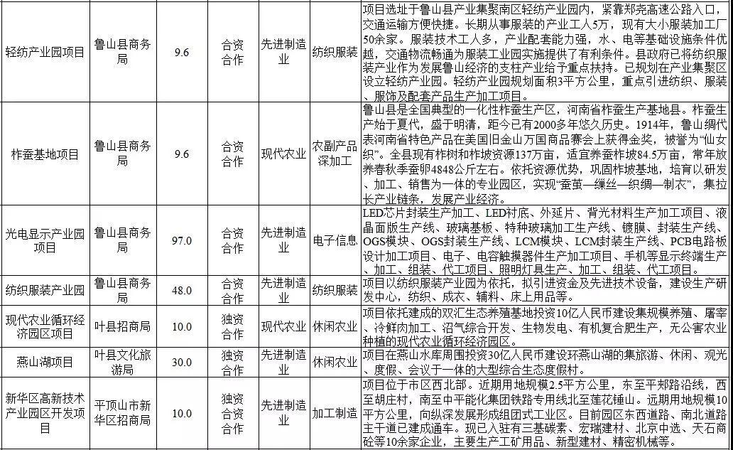 2018年平頂山市重點招商項目